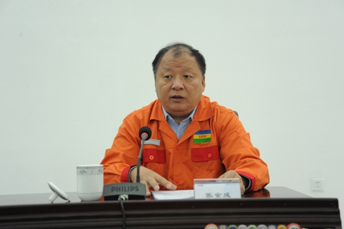 圖為集團(tuán)公司董事長(zhǎng)張金成匯報(bào)集團(tuán)公司整體廉政建設(shè)工作開展情況。