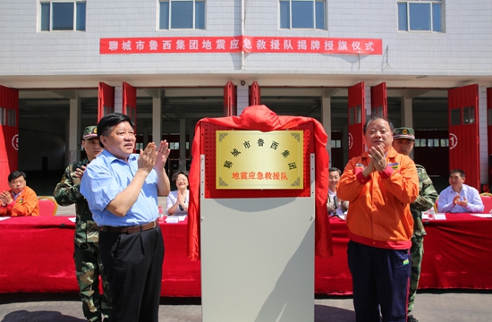 圖為聊城市副市長任曉旺(左一)和集團公司董事長張金成(右一)為聊城市魯西集團地震應急救援揭牌。