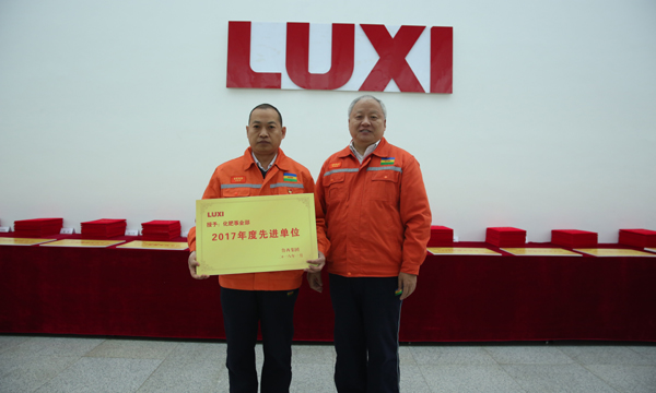 圖為董事長為先進(jìn)單位化肥事業(yè)部頒獎(jiǎng)。
