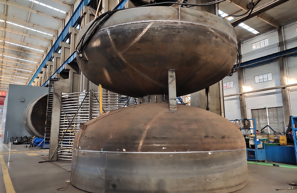 在設備加工技術創(chuàng)新方面,制造與工程事業(yè)集團技術人員努力攻關,自制工裝模具配合4000T 壓力機設備突破了容器膨脹節(jié)壓制技術瓶頸,實現(xiàn)容器膨脹節(jié)自制,同時對大直徑分瓣錐節(jié)組裝方式優(yōu)化,節(jié)約了成本,保證了項目設備需求。項目所需風管的組對制作,原工藝流程包括設備支腿焊接、葉片開孔按圖紙逐臺進行劃線定位、焊接、開孔,工作效率較低。技術人員摸索試驗了新的位置定位方式,使用模板對支腿、擋板位置進行劃線,工作效率提高了3 倍。
