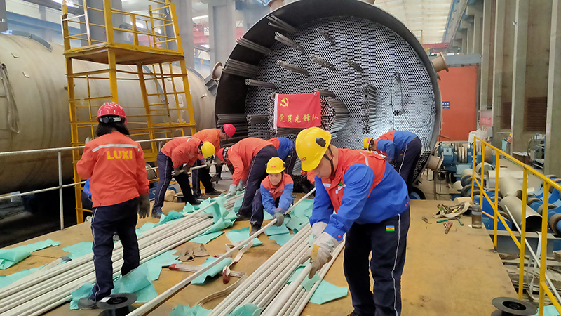 第三工程事業部黨支部組織開展“學黨史 悟思想”知識競賽和“學黨史 憶先烈 重溫紅色記憶 ”主題黨日活動;黨員干部組成突擊隊和先鋒隊積極參與車間換熱設備穿管工作。第三工程事業部承接的管式反應器外銷設備,需要穿管8500余根直徑32毫米,長12米的換熱管。由于工期緊,任務重,設備結構復雜,事業部黨支部號召大家學黨史見行動,以昂揚奮進的姿態投入到穿管工作之中。16名黨員發揮模范先鋒作用,不怕臟不怕累,心往一處使,勁往一處用,僅用5天的時間就完成了穿管任務,為后期組對管板奠定了基礎。