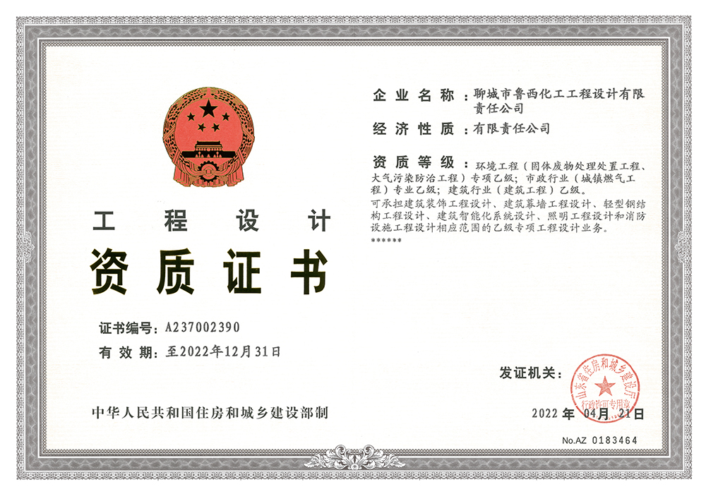 目前魯西設計院現有資質包括:化工石化醫藥行業甲級、輕型鋼結構甲級、固定式壓力容器規則設計、壓力容器分析設計(SAD)資質、石化化工醫藥專業資信甲級資質、建筑行業(建筑工程)乙級、環境工程(大氣污染防治工程)專項乙級、固體廢物處理處置工程專項乙級資質、市政行業(城鎮燃氣工程)專業乙級、工程咨詢單位乙級資信(生態建設和環境工程)、GB1級、GB2級公用管道、GCD級工業管管道(限亞臨界以下)、GC1級、GC2級工業管道等。